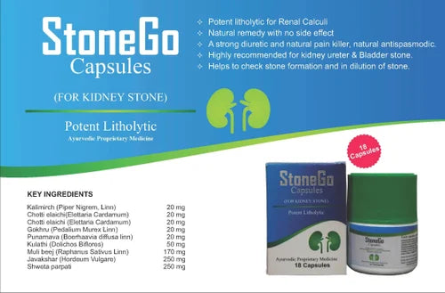 StoneGo Capsules contains a natural material that helps in dissolving the stone and helps in removing it out with very short therapy. The StoneGo is diuretic and helps in stopping the pain. It kicks out the stone from kidney or in urinary path. Stone Go Capsules can be used till the stone is neutralized.